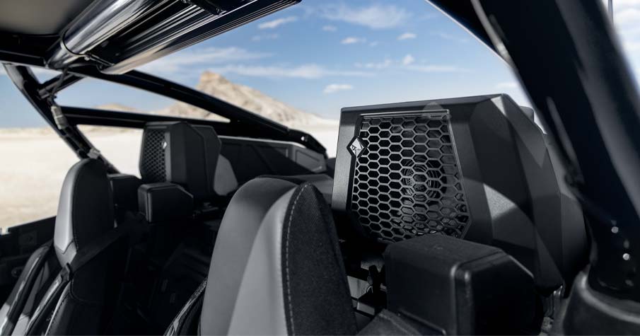 Ab Werk abgestimmtes und integriertes Rockford Fosgate Stage 4-Audiosystem mit RIDE COMMAND-Headunit. Enthält: (1) 1.500-W-8-Kanal-Digitalverstärker, (2) 100-W-1"-Hochtöner, (2) 100-W-6,5"-Frontlautsprecher (Komponente), (2) 100-W-6,5"-Hecklautsprecher (Koaxial) und (1) 10"-Subwoofer. *Audiosystem IPX7 und IPX9K wassergetestet für extreme Bedingungen.