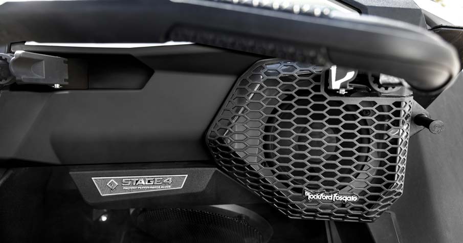 Ab Werk abgestimmtes und integriertes Rockford Fosgate Stage 4 Audiosystem mit RIDE COMMAND-Headunit. Enthält: (2) 100-W-1"-Hochtöner, (2) 100-W-6,5"-Frontlautsprecher (Komponente), (2) 100-W-6,5"-Hecklautsprecher (Koaxial), (1) 400-W-4-Kanal-Verstärker und (1) 10"-Subwoofer mit integriertem 400-W-Subwoofer-Verstärker. *Audiosystem IPX7- und IPX9K-wassergetestet für extreme Bedingungen.