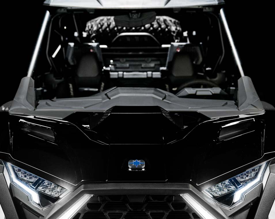 Signature-animierte RZR Fang-Akzentbeleuchtung; weiße LED-Abblend-/Fernscheinwerfer und rote LED-Rück-/Bremsleuchten; animierte Innenraum-Akzentbeleuchtung