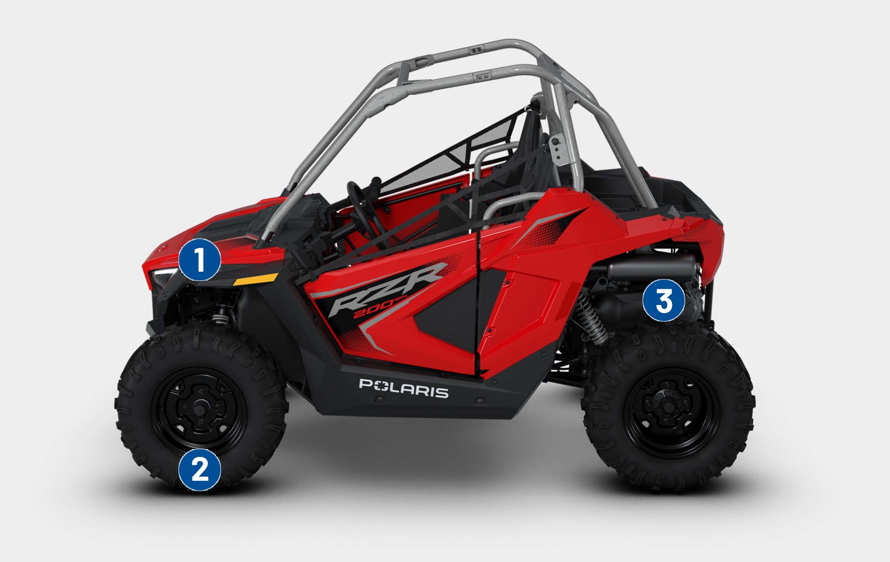 Sicherheitsgurt, Sicherheitsflagge, Sicherheitsnetze, vollständiger Überrollkäfig, kostenloses Online-Sicherheitstraining, Ride Control für Jugendliche (PIN-Start, Geschwindigkeitsbegrenzer, Geofencing)